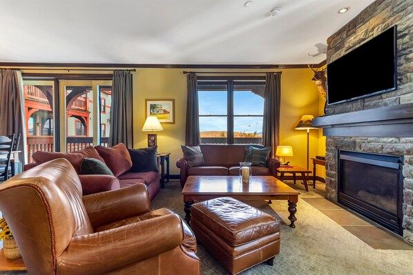 Living room: Leather seating, Large Smart tv/cable, over fireplace, walkout deck