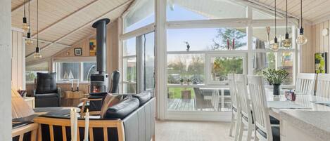 Unbeatable views accompany you throughout this holiday home, where 120 m² have been designed with a focus on functionality and holiday living. The bright kitchen-diner has a dishwasher, microwave and plenty of space for cooking together. The living room has satellite TV and large windows that open the room up to the landscape.