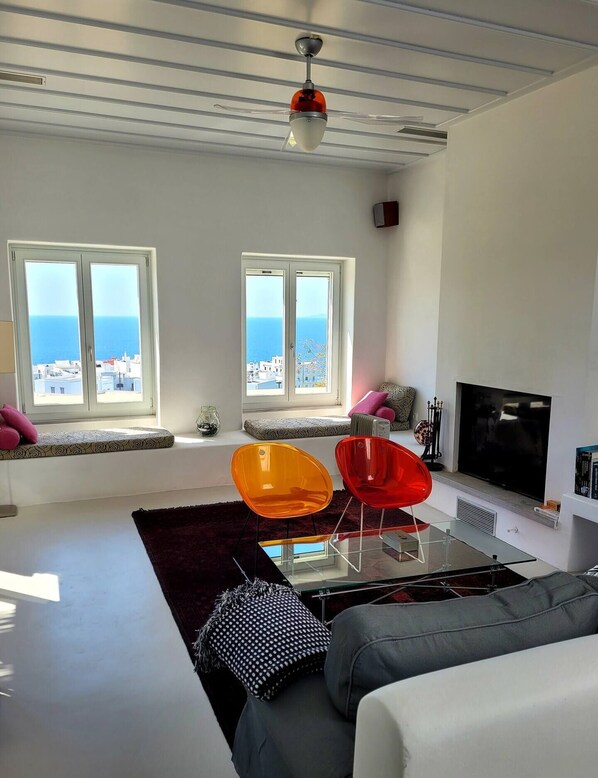 Perched above Tinos town, Villa Rosa-Maria offers a calm boho atmosphere with playful artistic touches and colourful tones. Enjoy breezy access to the beach of Kionia and Agios Fokas or unwind on the spacious veranda with panoramic views.
