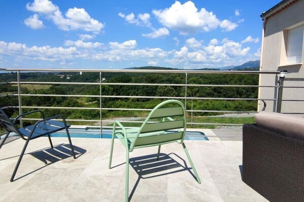 Pretty and peaceful new house with private pool, located in Vinezac, South Ardèche. Vallon Pont d'Arc is only 30 minutes by car (25 km).The house is 10 min walking (1 km) from center of village. Possibility of bike rental very nice rental in Pradons. The entire villa is dedicated to you. Nestled among the vineyards, between the « Gorges of Ardèche » and the park of « Les Monts d’Ardèche ». Three large bedrooms, bathroom, fully equipped kitchen, reverse heating pump (ground cooling), large living and dining room open onto a large terrace giving you direct access to the pool. Availability of a gas plancha for your barbecue.