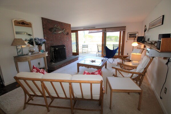 Built in 1978, this contemporary style cottage looks out onto a tidal estuary in the Lieutenant Island Road area of Wellfleet. The house is bright and open and nicely furnished and well equipped. The kitchen, living room and dining area along with a bedroom with a king bed and full bath make up the main floor. On the second level an open loft has two twin beds along with a sitting area. Sliders from the living area lead to a large deck and the beautiful views of the changing tides on the salt marsh. It is a 5-10 minute drive to Wellfleet Center and the beaches at the ocean, the bay and the ponds. An administrative fee and applicable taxes may apply. Linens are not provided—guests may bring their own or rent. This property does not have air conditioning.