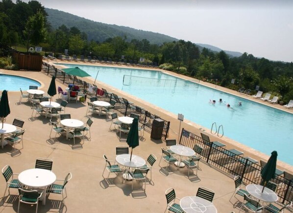 Large gas grill and two porches for outside dining, and nice Charcoal grill. Hot tub and gas fireplace on lower patio with sitting area.