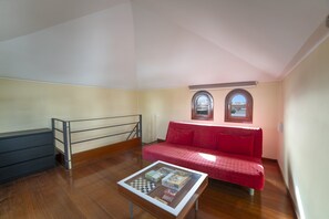 Ascend the open tread staircase from the main lounge to discover a cozy sitting area with a TV and a Wii game console, perfect for entertainment.