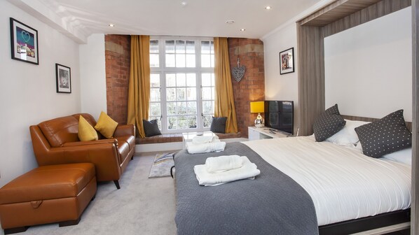 The apartment comprises a Luxurious bathroom with a spacious walk in shower, A sytlish kitchen area with the added benifit of undercounter lighting, led spotlights and high spec fixtures and fittings. The Kitchen comes fully equipped with everything you could possibly need for your stay, all utensils and appliances are there for your use including a brand new induction hob, cooker, microwave, washer/dryer, kettle and toaster. The apartment also offers a Generously sized Living/Sleeping area. The living space includes an extensive feature window that over looks the River Foss.