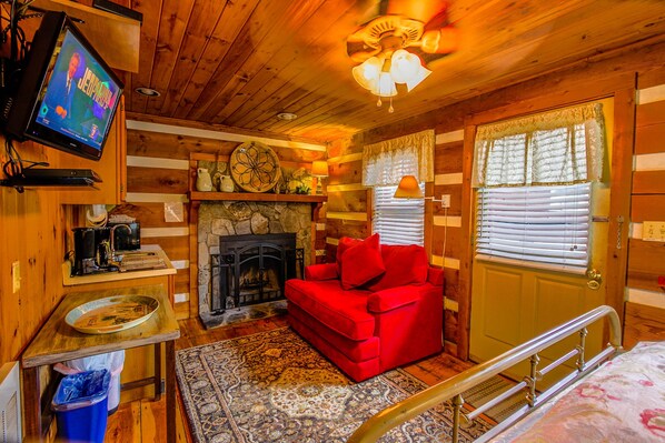 This intimate Queen Cozy Cabin on Main Street features an open floor plan with a single Queen size bed and separate bathroom. Amenities include a fireplace, wet bar with microwave and mini-fridge, private back porch, heating and AC, cable TV, DVD player and complimentary Wi-Fi. Enjoy our outdoor living room and landscaped garden scattered with cozy seating and a fire pit. Mountainaire Inn and Log Cabins is located on Main Street in Downtown Blowing Rock. In addition to being walking distance from shops and restaurants, the property is a short drive from outdoor activities, hiking trails, attractions, ski slopes, Boone, and Appalachian State University.