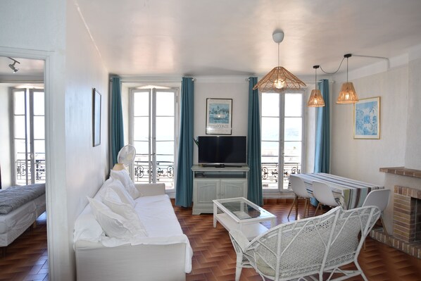 Idéal Vacances, Congrès : Appartement 3 pièces 50 m2 - 2 chambres, plein de charme situé en centre ville, dans le quartier historique du Suquet, avec superbe vue mer comprenant séjour-salle à manger, cuisine américaine équipée, Lave Linge, Lave Vaisselle, plaque de cuisson électrique, micro-onde, machine à café Nespresso, télé écran plat 110 cm, accès internet wifi adsl illimité.