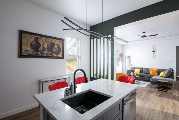 The Space: This brand-new home built in 2025 features a private garage with space for two small sedans or one large SUV, plus additional street parking for guests. The open-concept design offers a bright, modern atmosphere that's perfect for both business and leisure travelers.