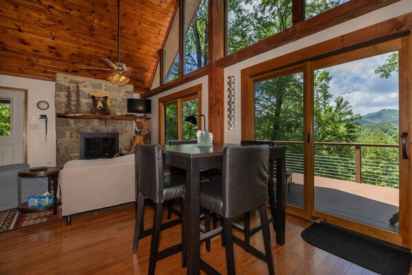 Welcome to this charming A Frame cabin nestled perfectly in the serenity of the woods with amazing open views off the back deck. The peaceful nature of this gem will blow you away. Two living room areas and multiple decks make this cabin feel spacious! Downstairs living room features a large Smart tv/dvd and an air hockey table. The main level living room features sweeping open views and opens to the main deck areas. There is plenty of comfortable outdoor seating and a table for al fresco dining. The wood burning fireplace on the main level offers ambiance for those cold winter evenings. Main floor dining room with seating for 4, as well as fully equipped kitchen, one full bath, and two bedrooms; one with a queen bed and another with twin bunks. The kitchen has a full size oven, fridge, and dishwasher, small appliances including a blender, an InstaPot, toaster, toaster oven, electric griddle, and an auto drip coffee maker. Upper loft has a King bed and full bath! NOTE, this area is a loft space and privacy is limited in the sleeping area. The lower level offers a living room with a large television, an air hockey table, bathroom, and a bedroom with twin bunk beds. You can walk out to the many decks this home offers from both the main level and lower level. You can walk out your front door to miles of hiking trails or pop in the car to Boone, Blowing Rock, Banner Elk and visit any number of local wineries, breweries, artisan restaurants, go antiquing on King Street or even take the kiddos to Tweetsie Railroad or gem mining! This community also sits on Elk Creek which is a state stocked trout stream! Check out Leatherwood around the corner for some Horseback riding, or walk to the clubhouse for some laid back paddle boating! Community pool is open seasonally and a fitness center is available for all guests. Community trash pick up every Monday. (We ask guests who choose to recycle to take recyclables with them or take to our local recycling center on Elk Creek Rd) Linens are provided at our cabins including towels and sheets as well as one roll of toilet paper per bathroom and one roll of paper towel in the kitchen. There is also a variety of spices and a small limited array of pantry items for guests. Powder Horn is about 45-50 mins to all the ski slopes including App Ski Mountain, Sugar Mountain, and Beech Mountain to name a few. PETS ARE ALLOWED ON THIS PROPERTY $50 per pet dogs only limit 2 please make note of pets when booking. Closest grocery store is Food Lion at the top of Elk Creek Rd which is about 8 miles or 15 mins in mountain time. It is about 20-25 mins to downtown Boone and App State. Other grocery stores include Lowes Foods, Publix, Harris Teeter and Earthfare. We encourage all guests to grab groceries before you arrive because once you get here you won't want to leave!!! Fly fishing, Appalachian Trail, Blue Ridge Parkway, tubing on the New River, App State Football, Merlefest, the Wooly worm festival... there is no shortage of things to do in this little town! We look forward to having you!!!