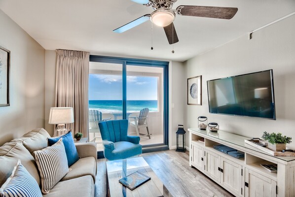 King size bed in bedroom, Queen size sleeper sofa in living room. Beautifully decorated with all new furniture, distressed wood floors and fresh coastal décor throughout. Enjoy the amazing view of the emerald green water and the gorgeous white sandy beach from the open balcony with seating for four. This unit is conveniently located near the elevator and is just steps away to the beautiful beach.