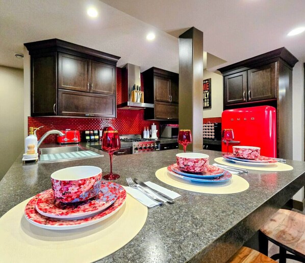 Fridge, microwave, oven, stovetop - Stylish 2BR Suite (15 Min DT): EV Charger, Free Parking, Soaker Tub & Projector (Edmonton)