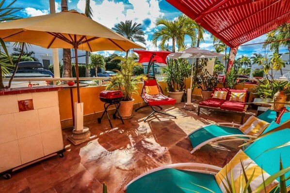 Immerse yourself in the warm ambiance of Beach Studio Picasso #3, with a spacious living area featuring a Queen convertible sofa and 58-inch Smart TV. Savor the comfort of your private beach retreat, complete with FREE coffee and tea, plus access to FREE beach towels, chairs & cooler.