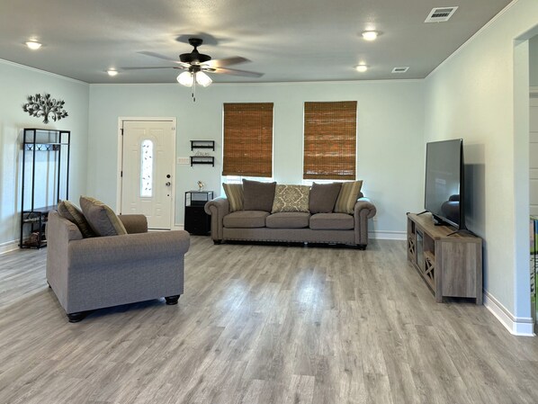 Overall we enjoyed our stay! Here are some pros and cons.Pros:- My kids absolutely loved the house. The outside play area was great, and they also enjoyed the twin bed with a slide and lots of toys. - The fire pit was a relaxing way to spend the evening.- Very clean- The kitchen was well stocked and they even provided some extras.Cons:- I'm not sure how it is supposed to sleep 8. The "twin futon" was an odd size and uncomfortable. The "twin sleeper sofa" was just a regular couch. It ended up working for our family (2 adults, 3 young kids), but be careful if you have a larger group or older kids/extra adults.- No closet access in bedrooms and no dressers except in the master bedroom. Also no extra pillows.- The neighborhood was kinda annoying to navigate, especially if you're traveling back and forth from the house to other sites several times during the day. Again, not a big deal but a little annoying.Overall we definitely enjoyed our time and would probably stay again.
