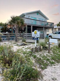 Walk up one flight of stairs and enter your own private beach escape. Decorated with coastal comfort in mind. The living room provides a bright open space, where you can take in the views of the world around you. Keep a look out for the dolphins that can be seen from the upper front deck, and, from the living room window. Enjoy the comforts of home in the fully equipped kitchen with new appliances where you will find everything you need to prepare a true southern seafood feast. Seating for up to six people is available at the dining table and two additional people at the extended counter space. If you would like a little salt air with your meal you will find a picnic table on the lower deck, and, a patio table on the upper front deck, perfect for enjoying a home style breakfast and sipping coffee.