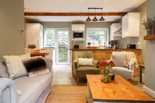 Apple Cottage, after your day’s explorations, welcomes you back to its traditional charm blended seamlessly with modern comforts and quality accommodation. The open-plan living, dining, and kitchen area invites you to relax by the traditional fire, enjoying modern amenities like Wi-Fi, Alexa, a smart TV with Netflix, and a selection of books and board games.