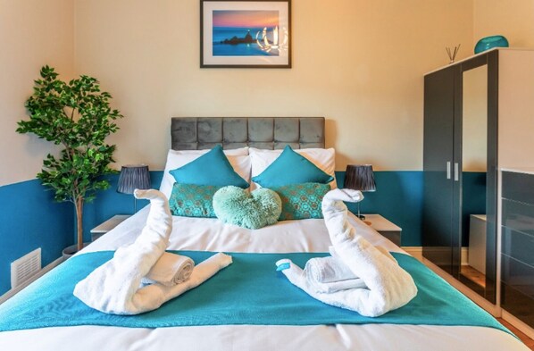 Clyde View Apartment has two large bedrooms, one with a king-size zip and link bed which can be changed to two singles where necessary, and a double bed, both with 1400 pocket sprung mattresses and crisp white bedding. A travel cot is available for babies upon request.