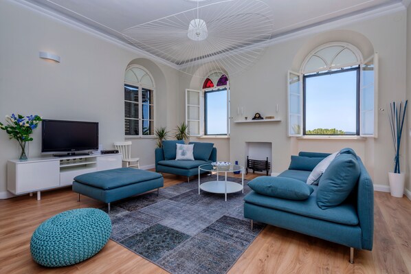 The living room is situated at the front of the building and is a beautifully proportioned room with high ceilings and an oak wood floor finish. A set of arched windows allows a stunning view of the crystal clear Adriatic and the nearby islands. There is a range of furniture including a sofa and seats, a modern, flat-screen TV and internet connection. A dining room area leads off from the main living room, which has a dining room table and chairs. This, in turn, leads through to the kitchen.