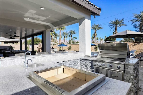 Outdoor dining area with a built-in Mediterranean Grill & mini fridge