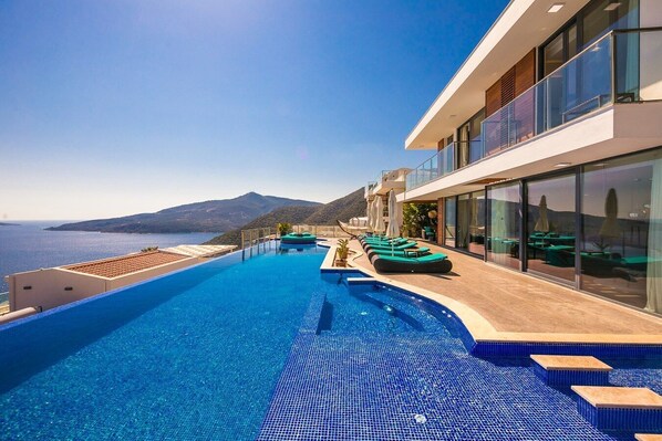 The villa is a luxury property with 5 bedrooms for up to 10 people, located in Kalkan Kalamar. All bedrooms of this villa offer a unique view. The outdoor terrace with large infinity pool , children’s pool, jacuzzi and many different seating arrangements, invites you to enjoy the great views of Kalkan Bay.