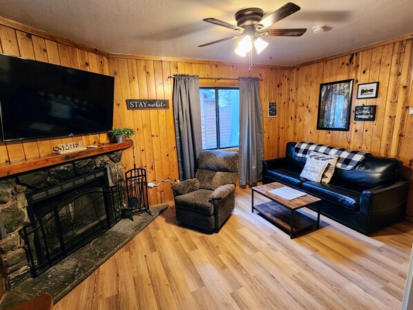 In the bedroom, you’ll find a queen bed and a full-size bed, plus a queen sleeper sofa in the living room for extra guests. The wood-burning fireplace adds a warm glow for movie nights, reading marathons, or just curling up with cocoa.