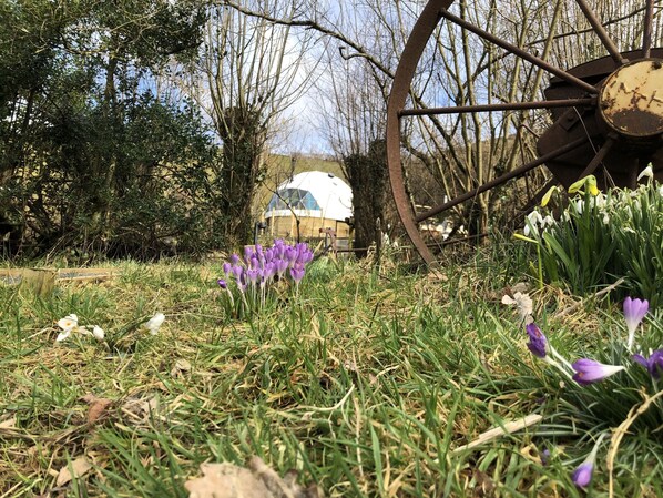 In the foothills of the Cambrian mountains, this 8m geodesic dome offers a romantic retreat with a wood-fired hot tub and pizza oven. Connect to nature with internet access, enjoy outdoor dining amidst an orchard setting, or unwind in front of the smart TV.