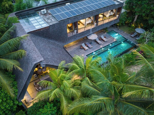 Nestled amidst lush rice fields in Ubud, Bali, The Wing Villa - designed by renowned architect - Alexis Dornier - blends contemporary elegance with the natural beauty of Bali. This exclusive 6-bedroom villa offers complete privacy and stunning views of the surrounding rice terraces. Its unique wing-shaped roof, gracefully extending over the living and dining area, creates a breathtaking architectural statement. Natural light filters through the skylight at the roof’s center, casting a warm, ever-changing glow that fills the space with a sense of calm and inspiration - the very reason this villa is named “The Wing.” Five of the six bedrooms provides refined comfort and tranquil garden views, while the 7 full bathrooms feature rain showers and natural stone finishes. The infinity pool opens to sweeping rice field vistas — an ideal spot for morning yoga or a sunset cocktail. Far from the bustle of city life yet just minutes from Ubud’s art galleries, cafes, and yoga studios, The Wing Villa is a private sanctuary that captures the essence of Bali: nature, design, and serenity in perfect harmony. We look forward to welcoming you to The Wing - your sanctuary in the rice fields of Ubud.