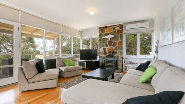 - Lounge area with large screen TV, DVD, wood heater, comfortable seating, leading to the entertaining deck with outdoor seating and Barbeque