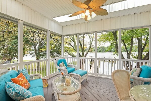 The outdoor space is perfect for relaxing or entertaining, featuring a fire pit, a grill, and a spacious lower patio. Downstairs, discover the Crab Room, a welcoming second living area that opens directly onto the patio, with easy access to the water and fire pit, making it an ideal spot to unwind after a day on the boat or exploring the shoreline.