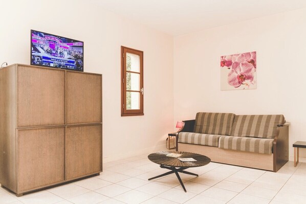 The lodges are not classified as part of the "Camping" category. The Villa-Gîte, designed for 4 to 6 people (3 rooms – 70 m²), includes:A bedroom with a double bed (140×190) and a closet/wardrobeA bedroom with two single beds (80×190) and storage spaceA living room with a dining table, chairs, and a convertible sofa (140×190)A flat-screen TV (80 cm) with TNT channelsAn open-plan kitchen, fully equipped with 3 ceramic hobs, an extractor hood, a dishwasher, a sink, a microwave oven, a refrigerator with freezer, crockery, kitchen utensils, an electric kettle, a coffee maker, and a toasterA bathroom with a bathtub-shower combination, a sink, a large mirror, and a hairdryerA separate toiletA 12 m² terrace with garden furniture