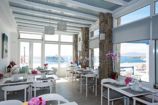 Turquoise waters surround this Greek island retreat where guests can sip coffee in the lobby while planning their next adventure to nearby islands