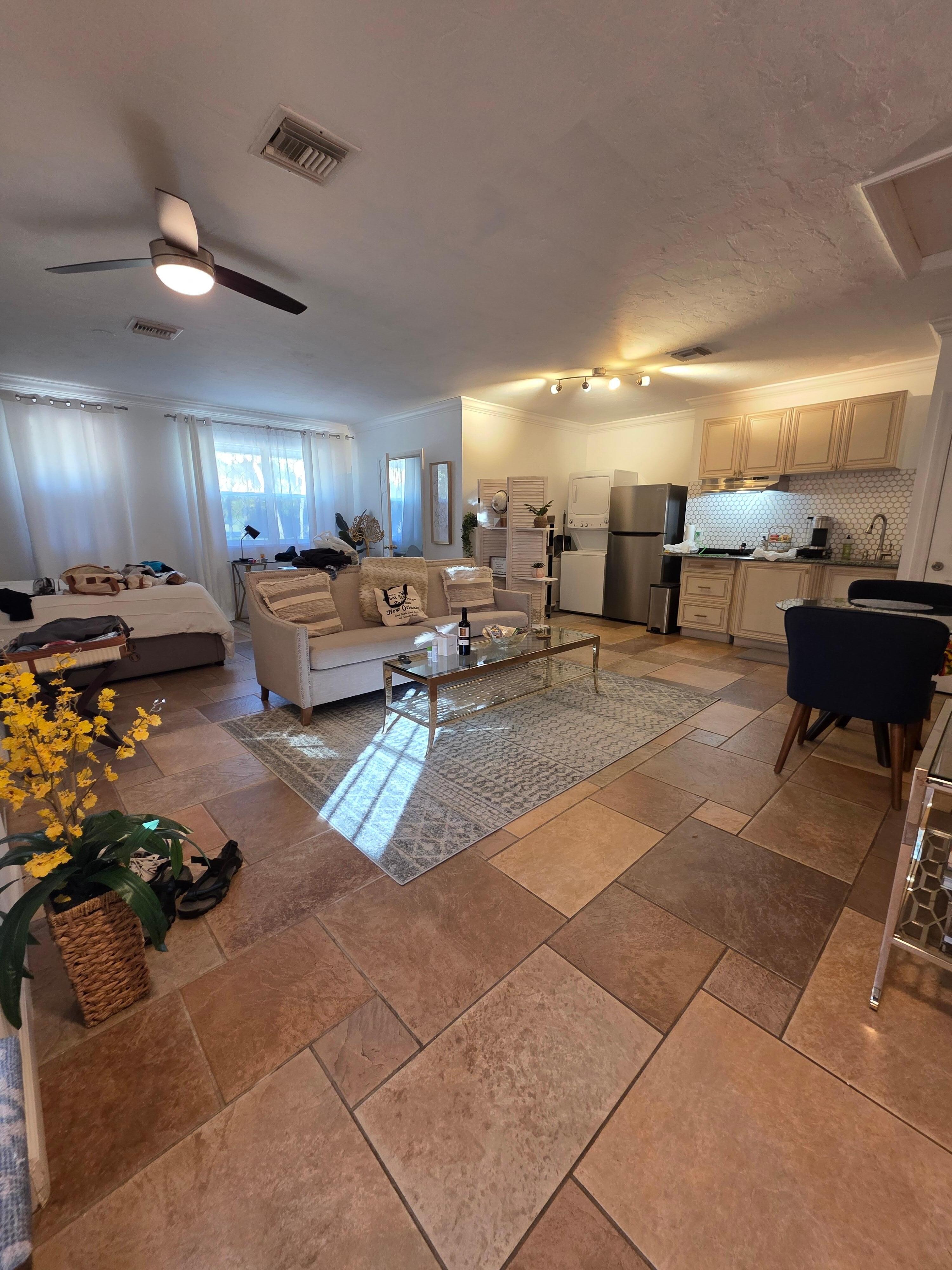 This fully-equipped studio has everything you need. You will enter to find a well-appointed living area with snacks and wine waiting for you. A dining area, set for two, is positioned near the kitchenette with a full-sized refrigerator and everything you need for whipping up a meal, or simply enjoying a cup of complimentary coffee or tea. A washer and dryer with provided laundry detergent will also help you feel right at home. Relax on the sofa and watch Disney+ or Netflix on the smart tv. In the spacious restroom, you will find a walk-in shower and large vanity fully stocked with essentials. The luxurious queen-size bed has crisp white linens and is ready for the perfect night's sleep. Catch up on some emails from the dedicated workspace. Outside, a patio set gives you an area to catch some sun's rays.