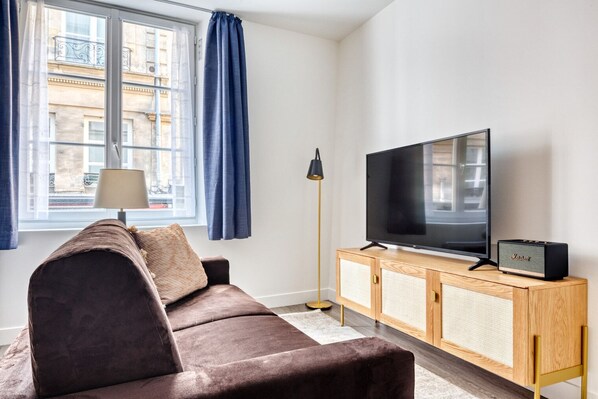 Thoughtfully designed with bespoke finishes, modern furnishings, and a fully equipped kitchen, you’ll enjoy that “I’m home” feeling with this Blueground apartment. Whether you’re lounging in your comfortable living room streaming the latest and greatest entertainment on the smart TV or premium wireless speaker, or getting some well-earned rest on the superior quality mattress with luxury linens, you’ll fall in love with everything this Le Marais apartment has to offer.
