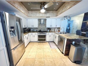 Both bathrooms are fully stocked with everything guests need during their stay; fluffy towels, makeup towels, hair dryers, cotton balls, Qtips, soaps, shampoo, conditioner, body wash, quality toilet paper, and more. The master en suite bathroom features a HUGE walk-in shower with multiple shower heads, and the other newly renovated bathroom has a tub & shower with all the same amenities as the master bath.