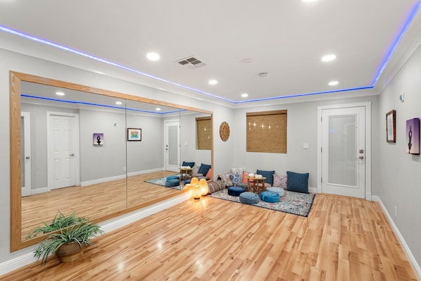 * Yoga/movement/exercise studio features full length studio mirrors, a Roku Tv with bluetooth soundbar, a floor seating tea lounge area and local art pieces. Yoga mats, blocks, blankets, and games provided in the studio.