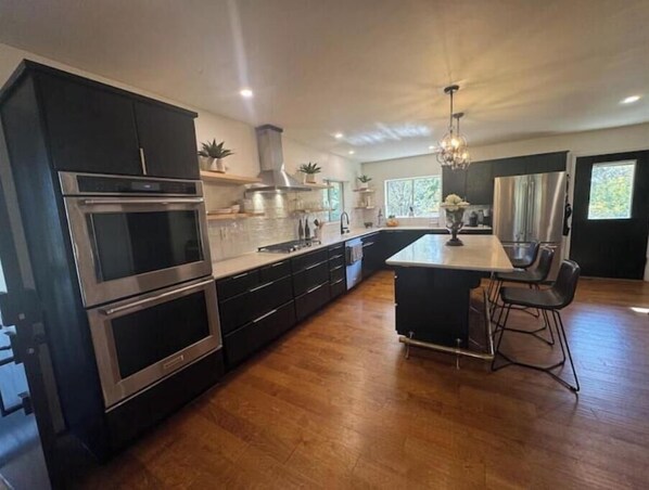 Kitchen is fully stocked with all the things to cook and entertain. Island seating for 3 and dining table seats 6.