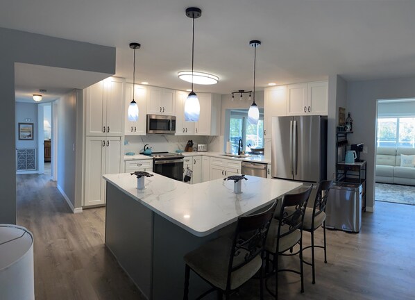 Have your breakfast and morning coffee from the Keurig on the lanai as you plan your day! The kitchen opens to the living area and features solid counter tops with a breakfast bar and 3 stools, ample cabinets and pantry, dishwasher, microwave, range, and everything else you need for preparing, cooking, and serving your vacation meals. making this the perfect space for cooking and entertaining.