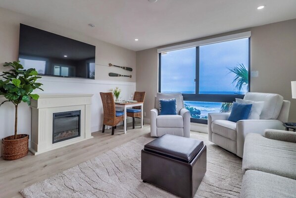 Enjoy stunning views from this condo's light and airy 3rd floor corner ocean view condo. Take in the gorgeous sunsets from the west windows that overlook the ocean, beach, and boardwalk. Don't forget the view you will see through the north windows of the hills of La Jolla! The kitchen has hardwood cabinets, marble countertops, stainless steel appliances, and waterproof luxury wood look vinyl floors throughout the unit. All new furniture features a king size bed in the master bedroom and a flat screen TV. The second bedroom also has a king bed along with a vanity with a sink and mirror. A top-of-the-line queen sofa bed offers additional sleeping space in the living room if needed. The living room has a NEW electric fireplace for cooler nights in!