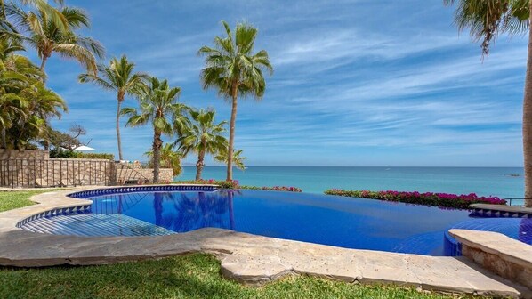 Outdoors, you’ll find well-manicured lawns, palm trees swaying in the sea breeze, colorful and exotic flowers with an open-air terrace, wet bar, barbecue, and infinity pool overlooking the ocean. Villa Pacific Palmilla includes a relaxing stone courtyard and tiered water fountain.