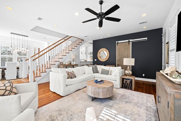 A spacious front porch furnished with Adirondack chairs sets the tone for a tranquil getaway. Inside the home, swathes of natural light highlight the gorgeous hardwood floors throughout the first floor. To the right is a living space, where a slip-covered corner sofa and 2 plush armchairs offer seating around the 65†Roku TV. On the left, an 8-person wood dining table awaits lively meals, while a spacious kitchen features quartz countertops, a Viking 5-burner gas stove, and a breakfast bar with 3 stools. The back door leads to an airy screened porch with soft patio seating and peaceful nature views—the perfect spot to indulge in a morning brew. Off the porch, guests will find additional seating and a propane grill for delicious barbecues. There is a sleeping nook with a built-in twin-over-twin bed, or guests can retire to the private guest bedroom, accessible only from the back porch.