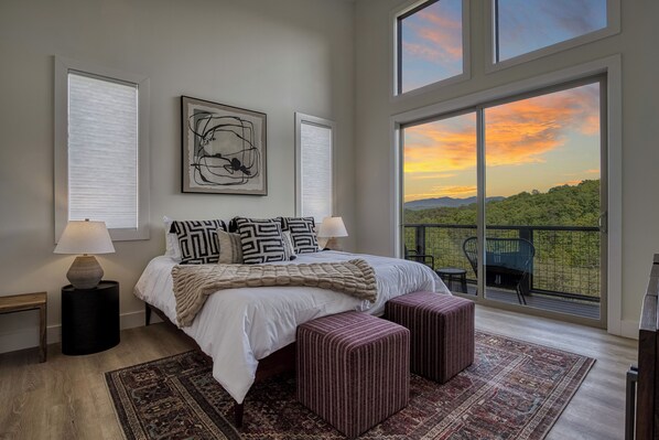 Upstairs, a cozy sitting room awaits with large windows that offer panoramic views of the mountains. Sip coffee from the Keurig machine while you read a book or watch TV in this comfortable space. The upper level also features two bedrooms, each with a king-sized bed and full bath. Each of the bedrooms has its own doorway to a back porch with incredible views, making it easy to wake up to the stunning scenery.