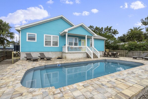 Blu Star Oasis is your luxurious retreat in Davis Shores, St. Augustine. Enjoy endless entertainment with the pool and pickleball court, then relax at home or take a short drive to downtown St. Augustine or the beach for a stroll along the shore.