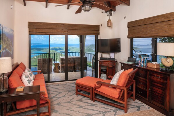 The covered patio area is perhaps the favorite place to unwind with a table for eating and comfortable chairs to soak in the sweeping 180 degree views of Coral Bay, Norman Island, Tortolla, and beyond.