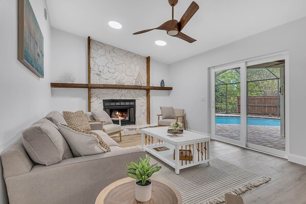 -second living room with the fireplace and pull out queen sofa bed