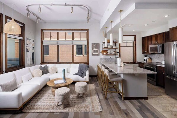 Step inside and you’ll find high ceilings, large windows, and a bright, open floor plan that immediately feels inviting. The living room features a plush sectional and smart TV, while the fully equipped kitchen with stainless steel appliances and breakfast bar makes dining in just as enjoyable as a night out. A cozy dining area is perfect for meals together before heading out for a stroll along Lincoln Avenue or cocktails on Yampa Street.
