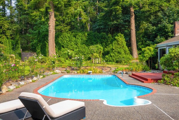 Private pool with outdoor seating, ideal for family fun or quiet relaxation
