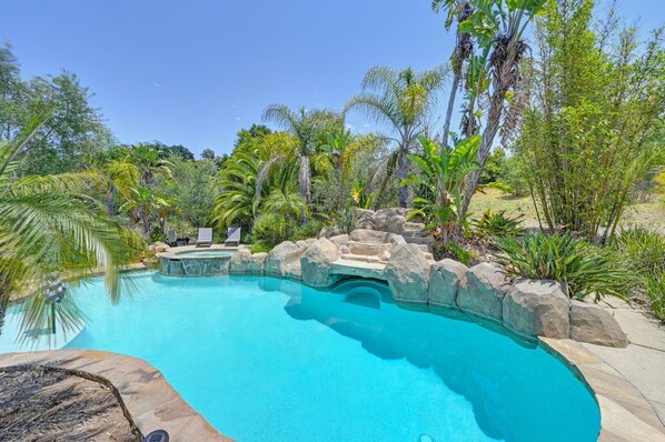 - Private resort-style pool and hot tub with water slide (pool heating available for $250/day, minimum 2 days)