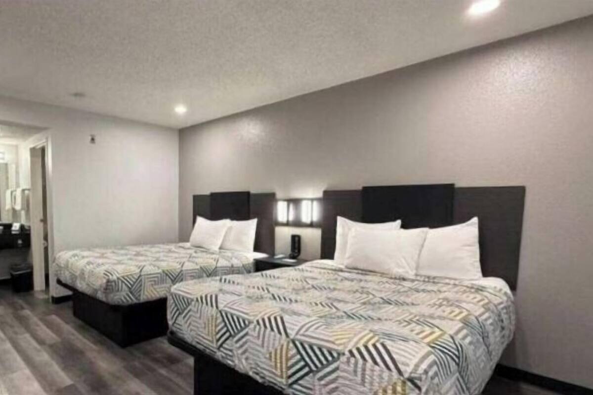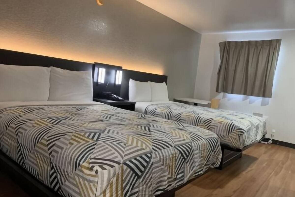 显示2张全尺寸床;行动无障碍淋浴;吸烟房;带微波炉冰箱的所有照片