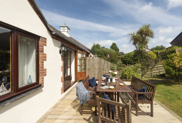 Outdoor dining - Keepers Cottage is one of four cottages in the original Stables at Roserrow. (Wadebridge)