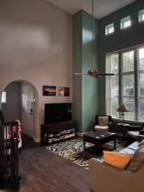 This two-bedroom, two-bath townhouse offers the comfort of a standalone retreat with no neighbors above or below. Expansive 20-foot ceilings and large windows fill the open-concept living area with natural light. Thoughtful furnishings and tranquil décor create a warm, inviting space to relax after a day in the sun.
