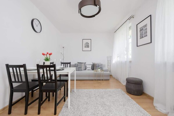 This functional and traditionally decorated apartment is designed for four people. The unit is located on the ground floor and has a furnished balcony with a chair and a table - an ideal place for those who want to drink their morning coffee outdoors or relax during a break from planned activities. The living room features a sofa bed in a stylish gray shade, as well as a dining table with chairs and a television with access to cable channels. The room also features cabinets for convenient storage of handy trinkets. A separate kitchen offers guests a dining area with a table and stools, as well as appliances such as a gas stove, oven, gas kettle, steamer and waffle iron. In both the hallway and the bedroom stand capacious closets ideal for storing brought clothes and footwear. The bedroom is also equipped with a comfortable, large double bed, as well as a desk with a chair, where you can comfortably work remotely. In the bathroom, a shower, washing machine, hair dryer and a welcome toiletries kit await visitors. The decor is in soft colors, so you can count on a cozy atmosphere and comfortable space here.