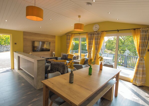 Blakeholme Lodge Plus, on a woodland slope by Windermere's shore, features a walk-in shower room and en-suite facilities with vanity units. The kitchen is equipped with refrigerators and microwaves, ideal for larger families.